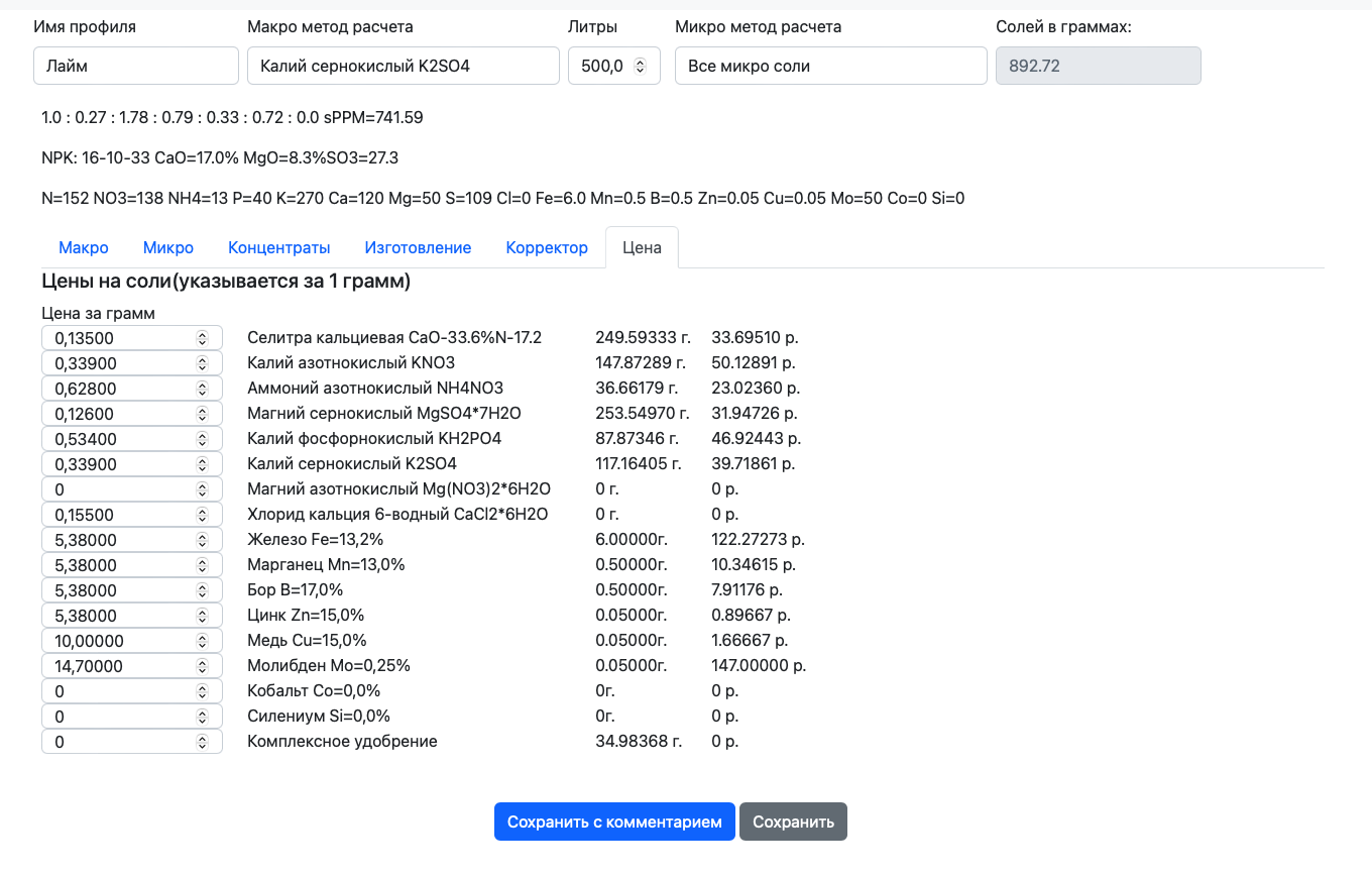 В итоге у меня 518р вышло на 500л растворная - это 1л=1р, дорого этот или нет решать Вам, из удобрений выше можно сделать еще дешевле, ниже сравним расчет ГХЕ
